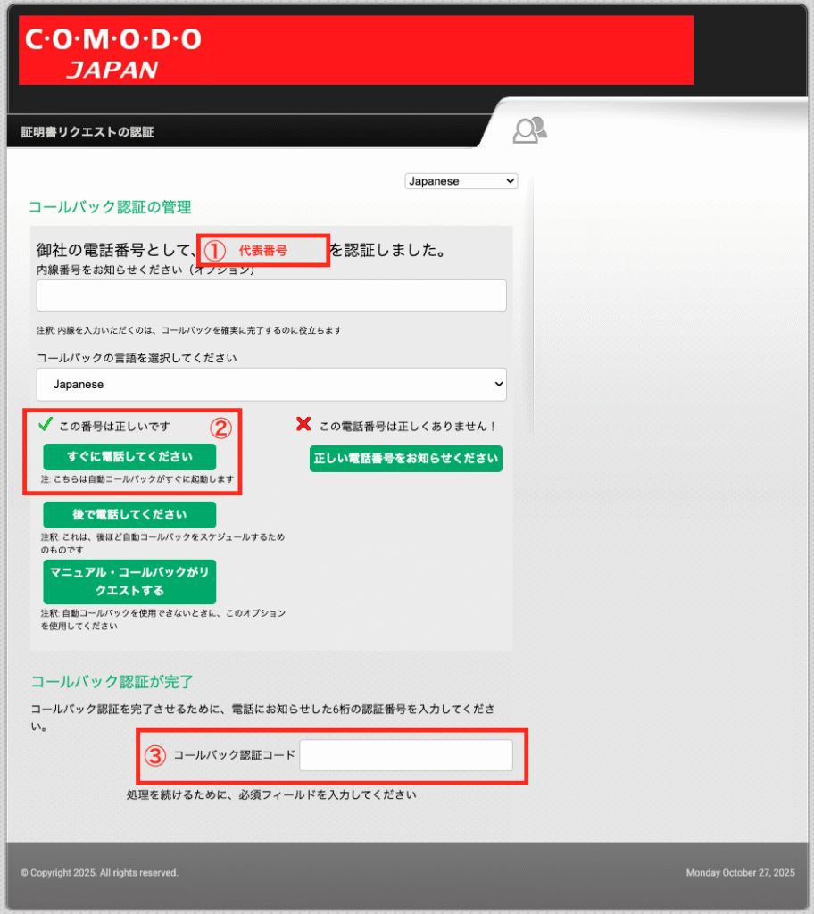 OV(企業認証) および EV 認証 の各証明書の発行を完了するためには、認証局 (CA) が発行する証明書に記載する組織の担当者に確認の電話をかける必要があります。